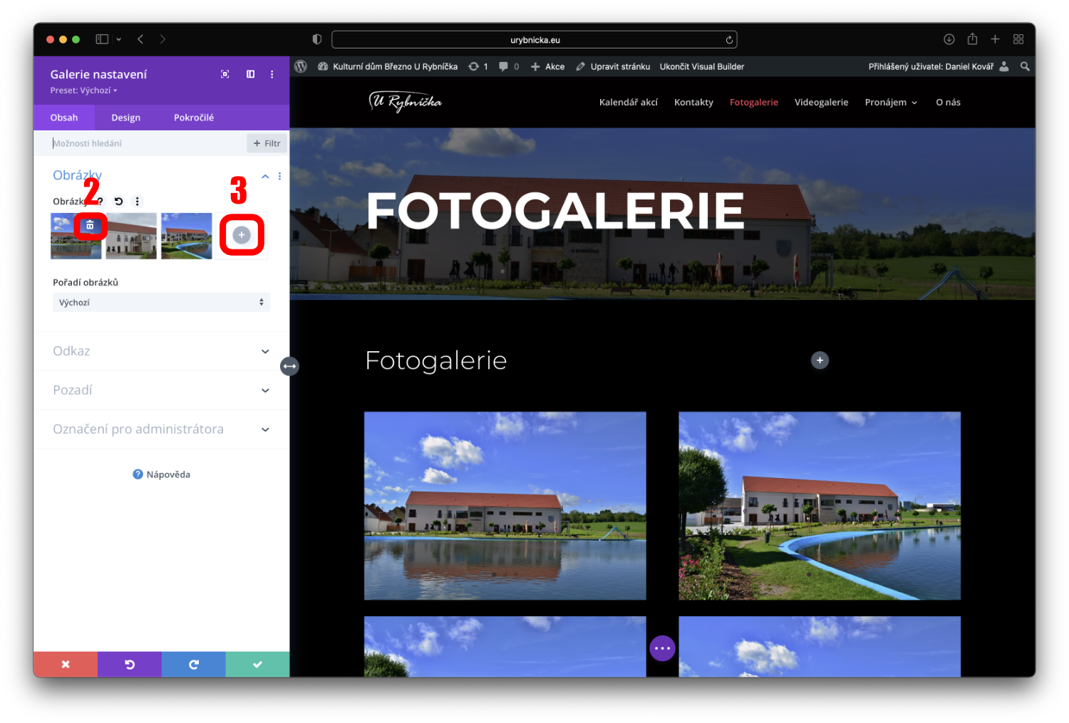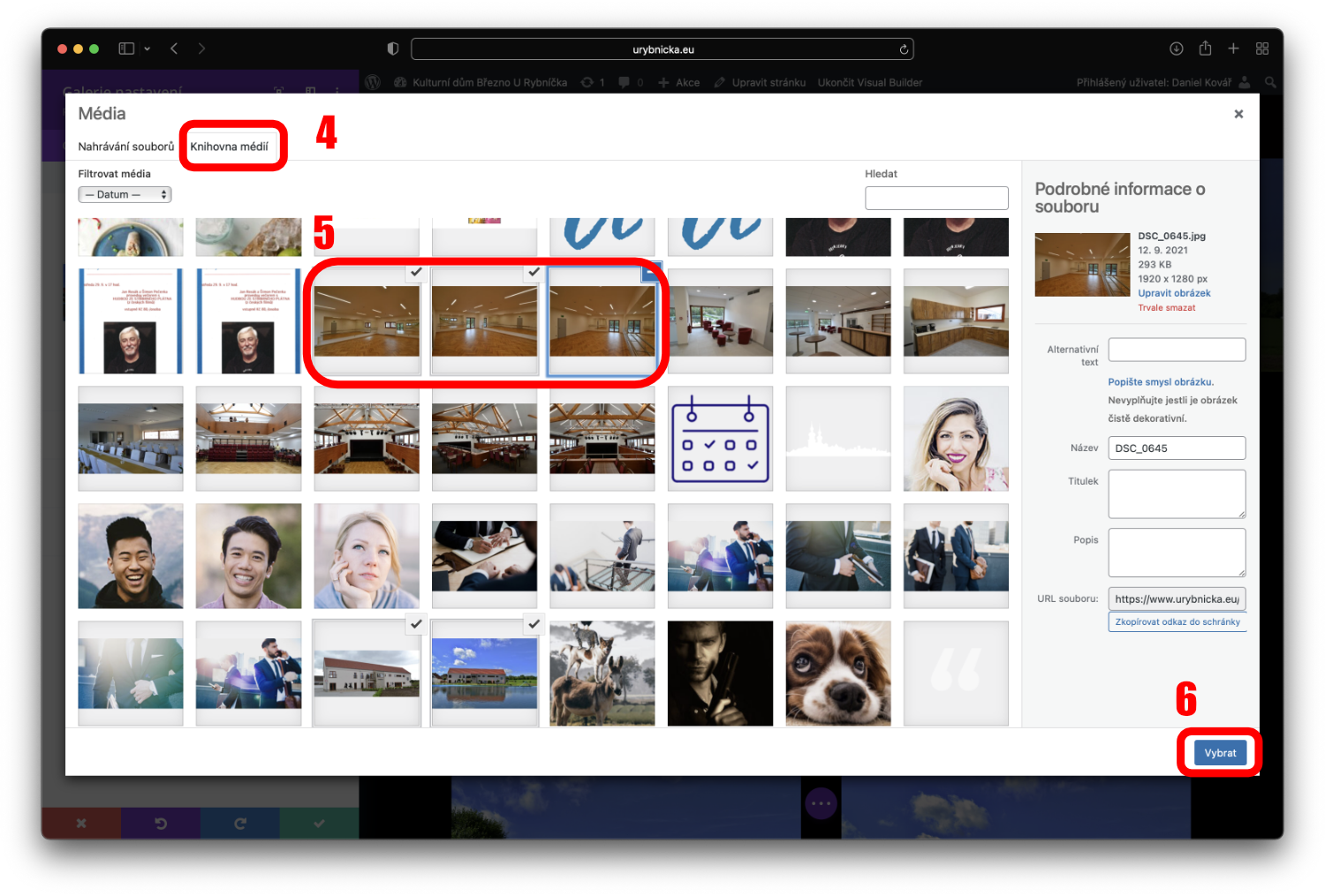 Po kliku na přidání fotografie se otevře okno s Médii (4). Lze vybrat fotografie z knihovný médií (5) - klikem na foto přidat nebo klikem na mínus odebrat.