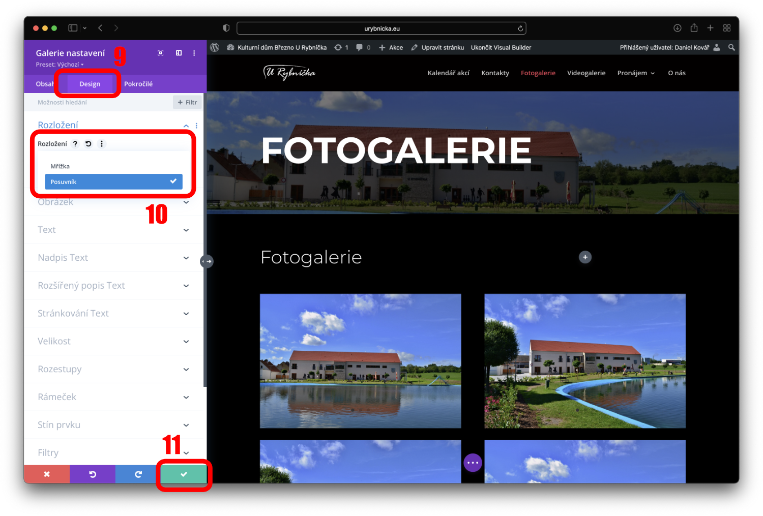 a) Posuvník, kde v 1 okně lze šipkami posouvat fotografie a poklikem vyskočí fotogalerie přes celou stránku.