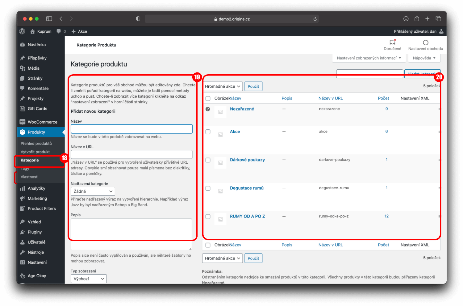 Novou kategorii lze přidat v levém sloupci (19) a lze vytvořit několik vlastností kategorie. V pravém slouci se vytvořené kategorie zobrazí (20).