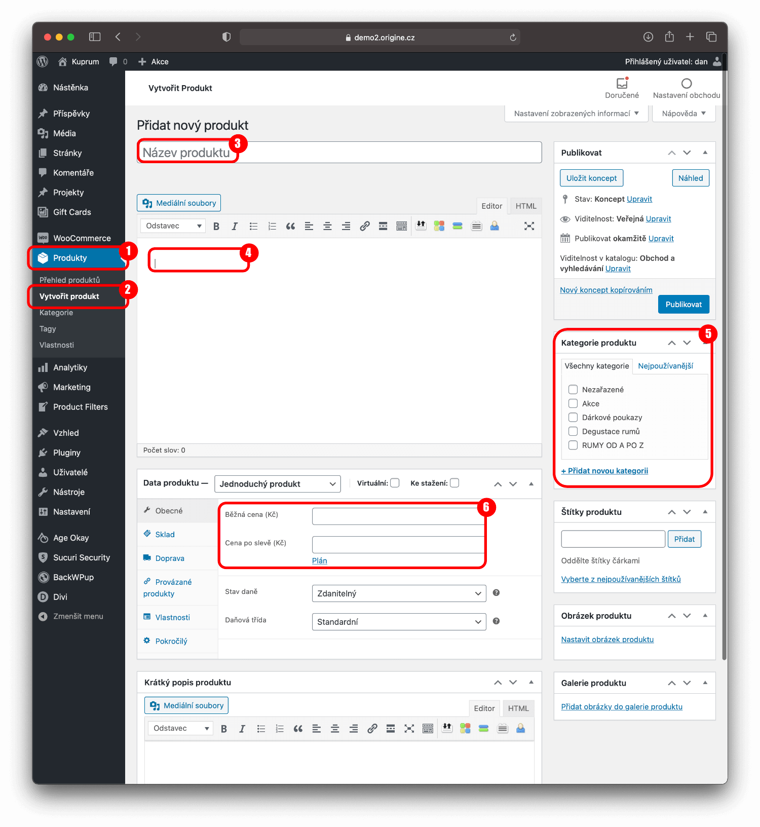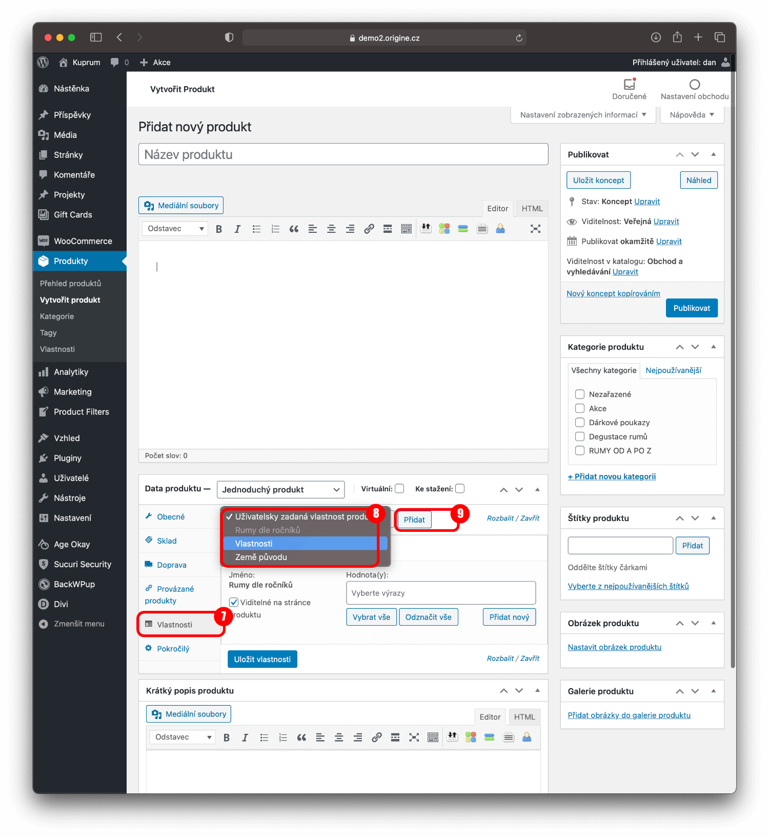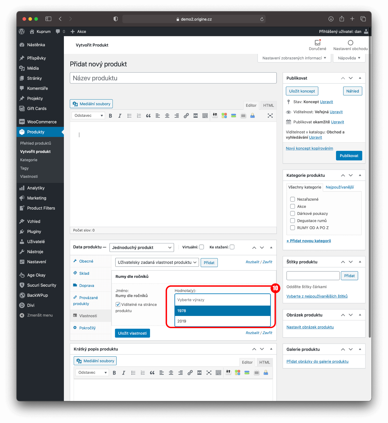 Po vyplnění vlastností nesmíme zapomenout produkt uložit a pubklikovat (13).