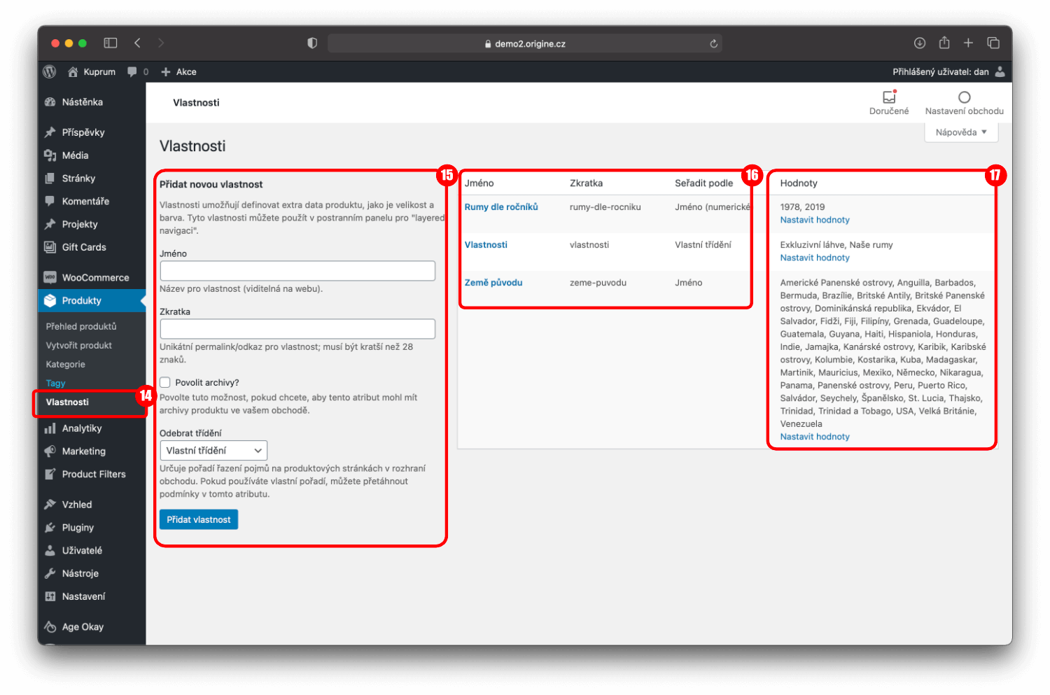 Zde lze Přidat novou vlastnost (15), která se přidá do seznamu vlastností (16). Pokud chcete editovat již existující vlastnost, staší najet na příslušnou vlastnost a objeví se editační menu.