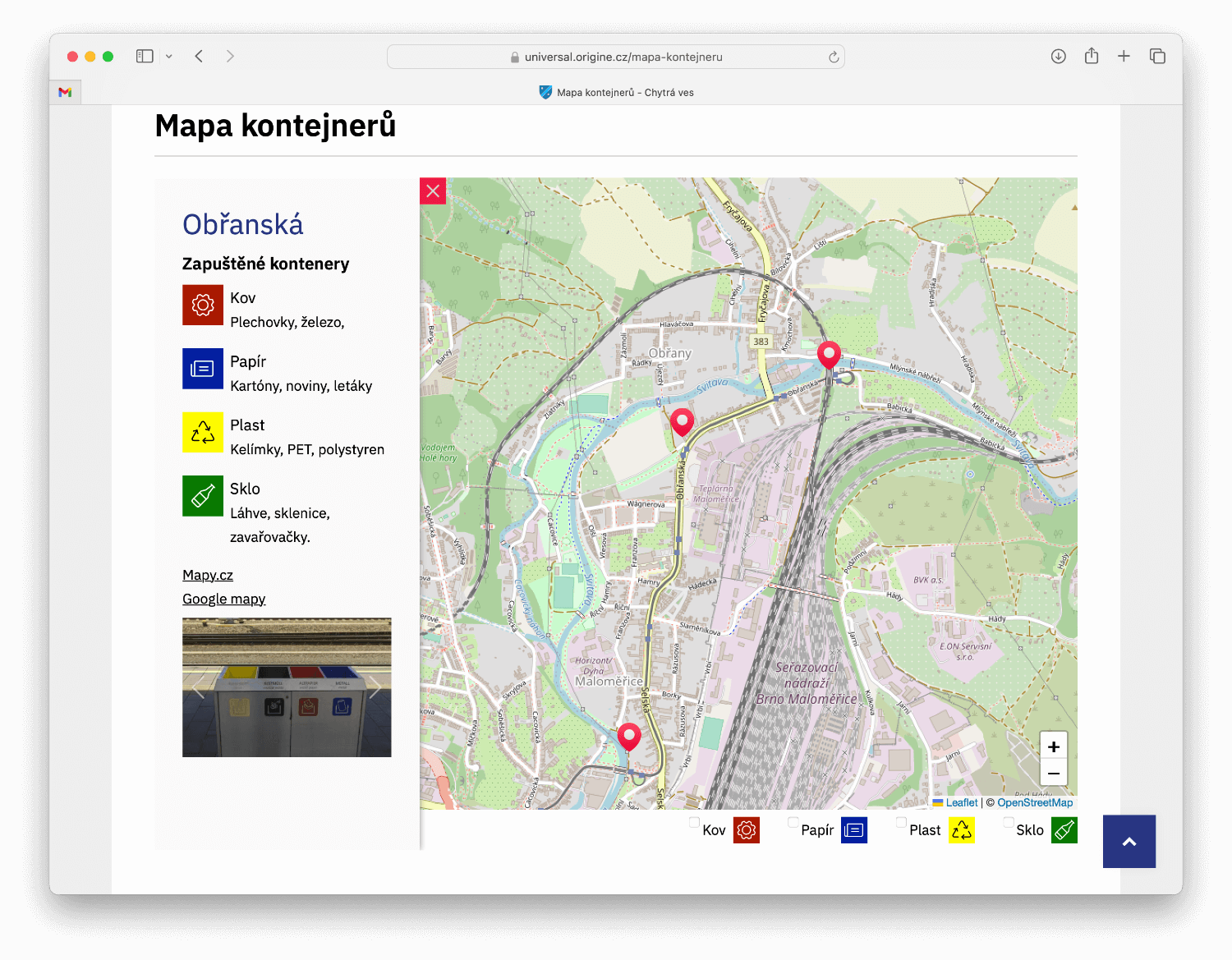 Modul pro zobrazení mapy s kontejnery na tříděny odpad.