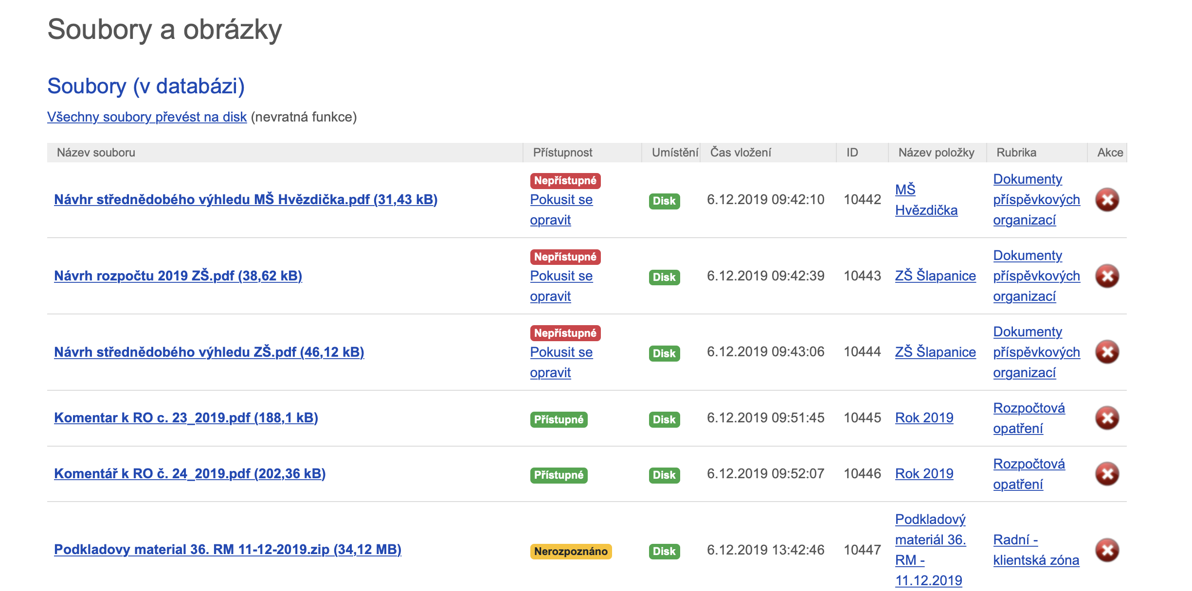 Dále v seznamu souborů (Soubory > V databázi > Soubory nebo Soubory na úřední desce) se ukazuje, které soubory by mohly být problémové.
