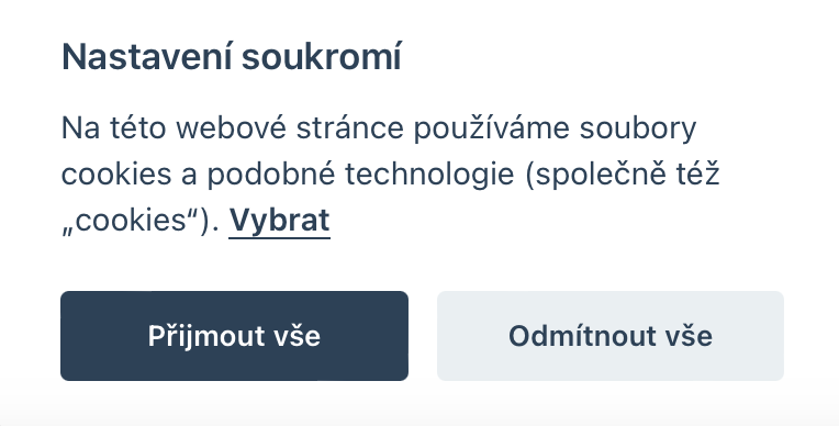 V systému integrována centrálně cookie lišta na klik. Lišta spravuje spouštění aplikací a ukládání cookies na základě uživatelských preferencí.