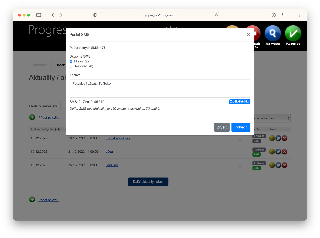 Rozesílka SMS pomocí modulu Aktuality nebo formuláře.