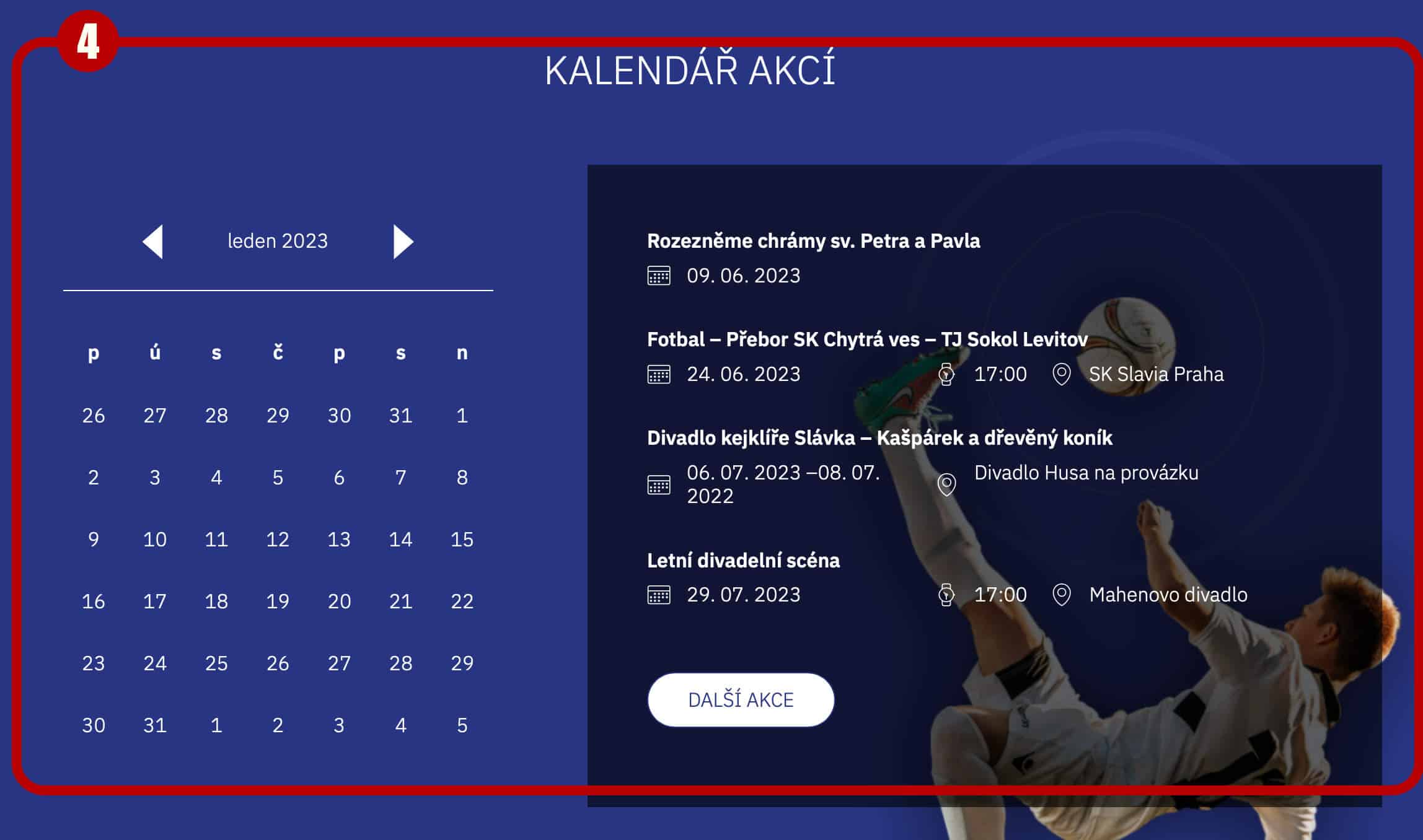 Kalendář akcí (4) se generuje a nastavuje podobně jako Aktuality, jen zvlášť pro kalednářík a zvlášť pro seznam. Pozadí sekce lze změnit přejetím přes tuto sekci a objeví se pomocné menu vpravo nahoře s ikonkou editace vlastností sekce