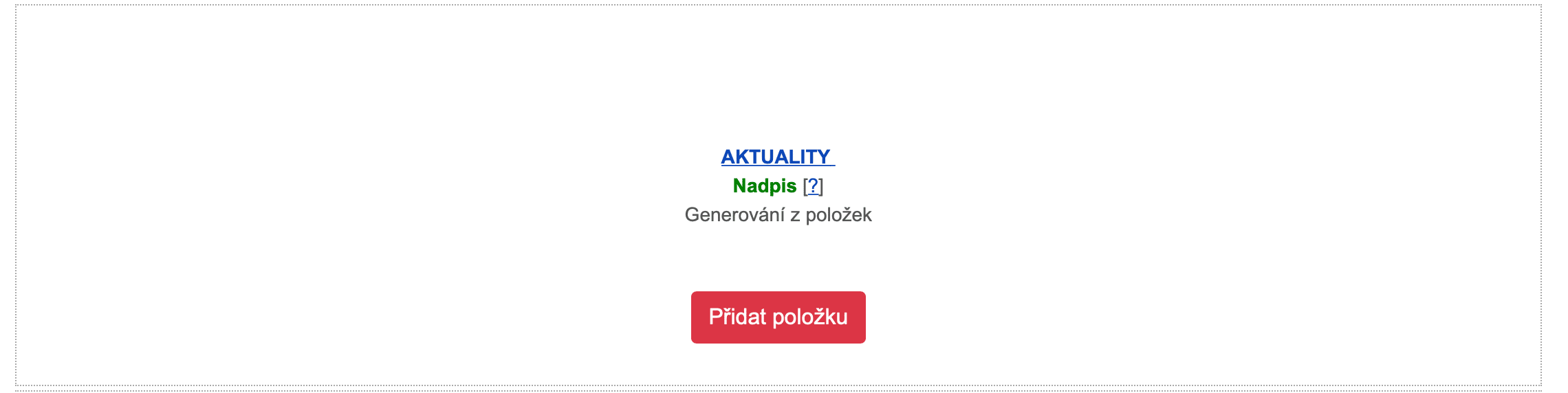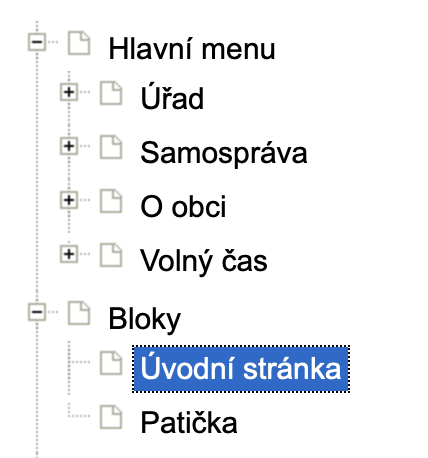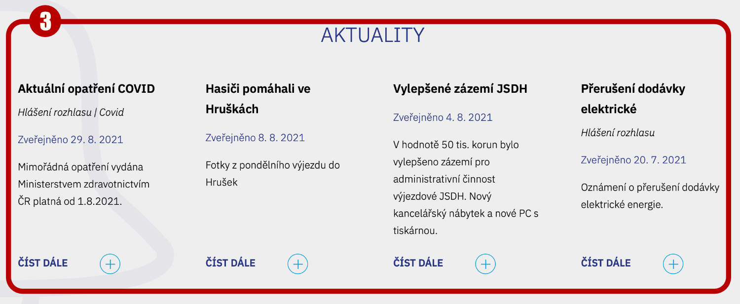 Aktuality (3) se vkládají v příslušné rubrice Aktuality. Zobrazení na úvodní stránce se upraví v menu klikem na Bloky > Úvodní stránka. Třetí sekce > položka AKTUALITY typu Generování z položek. Lze nastavit zejména grafika – šablona nabízí několik typů a zobrazení. Dále lze nastavit řazení, počet aktualit a případně omezující podmínky.